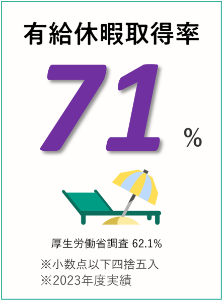 有給休暇取得率: 75% 厚労省調査62%(2024年12月発表): ※小数点以下四捨五入 ※2024年度(令和6年度) 有給休暇取得率: 75% 厚労省調査62%(2024年12月発表): ※小数点以下四捨五入 ※2024年度(令和6年度)